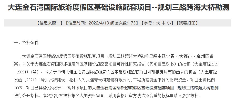 摘要:?? 乐居买房讯 4月13日,乐居编辑从大连市公共资源交易平台获悉,大连金石湾国际旅游度假区基础设施配套项目规划三路跨海大桥勘测正在招标,招标人为大连青云河建设有限公司,招